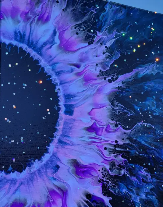 Swirl deep purples, blues, and blacks with shimmer and metallic accents to create dimensional galaxy art. The depth looks like you’re staring into deep space.